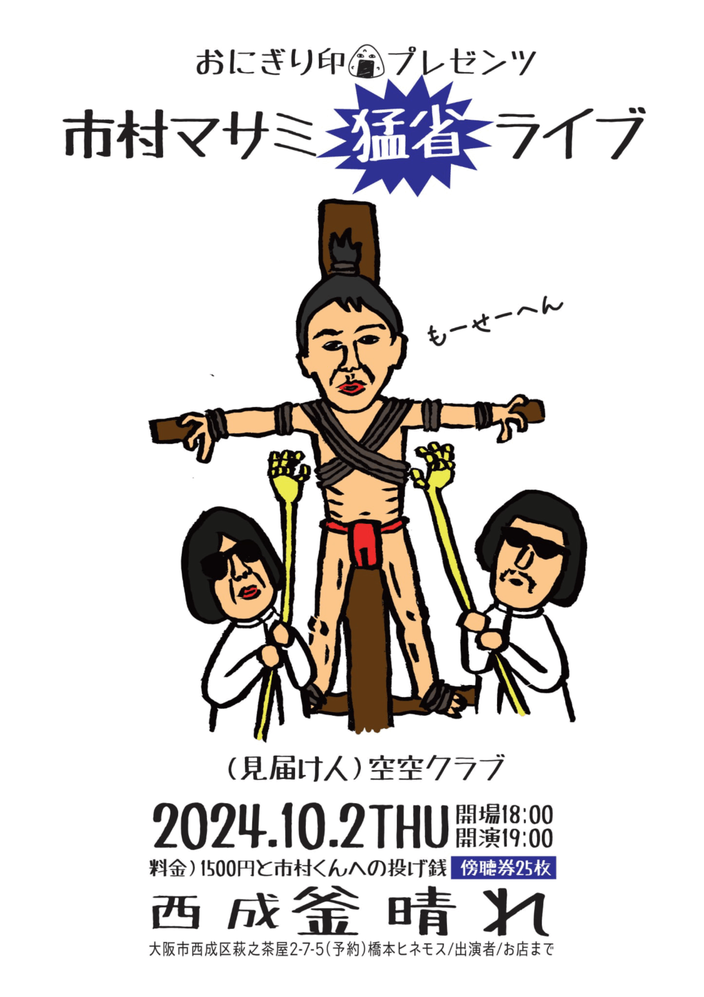 2025年9月25日 / 最終更新日時 : 2025年9月25日 hashimoto おにぎり印 終わってません! 来週、木曜日、2025年10月2日開催の、【おにぎり印プレゼンツ「市村マサミ」猛省ライブ(見届け人:空空クラブ)@釜晴れ。】 フライヤーの日付、2024年になってるやないですか! 今日、ターボーくんに言われるまで気づかな […]