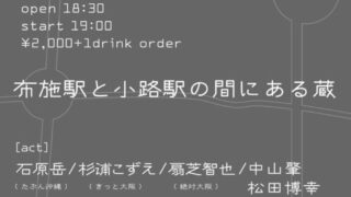 なんだかやばそうな情報が流れてきた。 いろいろはっきりしない。場所すら、「来る」という人に個人的に知らせる、というやり方。わかっているのは、ワシの知り合いの沖縄高江の石原岳さんがソロで出るってこと、岳さんが、ソロってこと … 続きを読む 扇芝智也、杉浦こずえ、中山肇・松田博幸・三刀月ユキ、石原岳@布施駅と小路駅の間にある蔵。