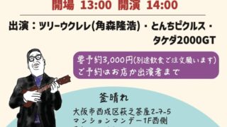 久しぶりのおにぎり印、冠イベントです〜〜!もう一人でも、おもろすぎるミュージシャンが、三人、束になって、西成の萩ノ茶屋の釜晴れにやってきちゃいます。 これは、ソールドアウト必至やなあ!お早めにご予約ください〜〜! ああ、 … 続きを読む おにぎり印の特撰演芸会「ツリーウクレレ(角森隆浩)、とんちピクルス、タケダ2000GT」@釜晴れ。