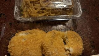 肉屋のコロッケ二つと、カレー屋さんのお惣菜麺、合わせて114円!! 今どき、この金額やとコンビニでおにぎりも買えんわ!夕方、閉店間際の値引きセールではあるものの。 Follow me! @dodomeippatsu