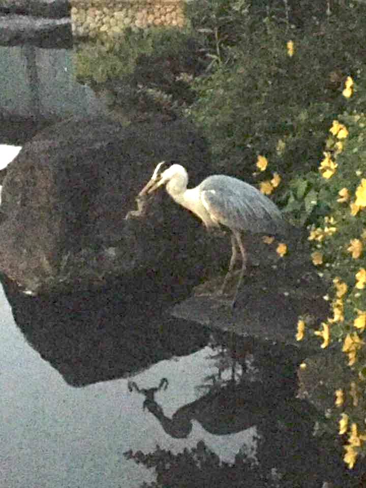 池では鷺がカエルをお食事中で、