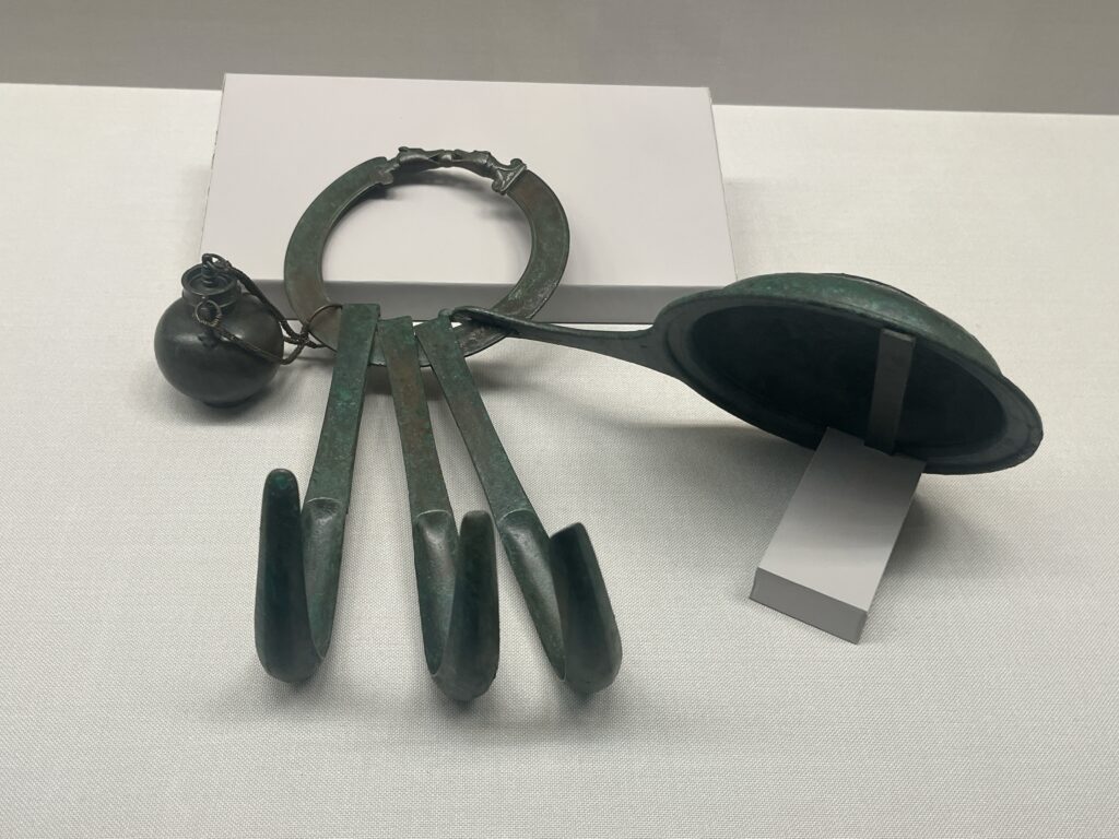 左から、アリュバロス(香油壺)、3本のストリギリス(肌かき器)、