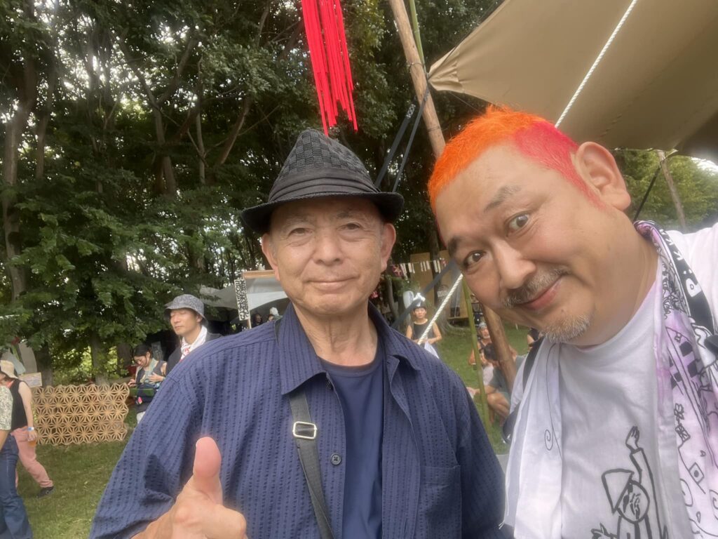 草原ステージに行くと、いきなり沖縄民謡のレジェンド大工哲弘さんと遭遇。