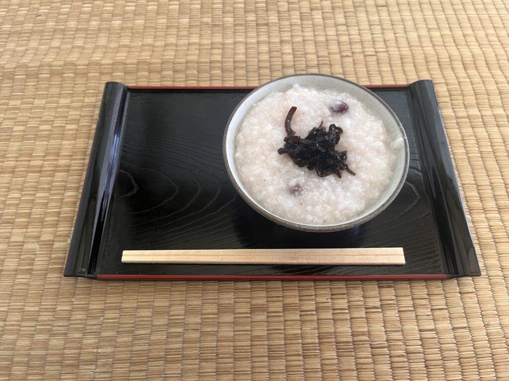 割り箸が添えてあるが、割らずにスプーンみたいにして食べるのがええらしく、