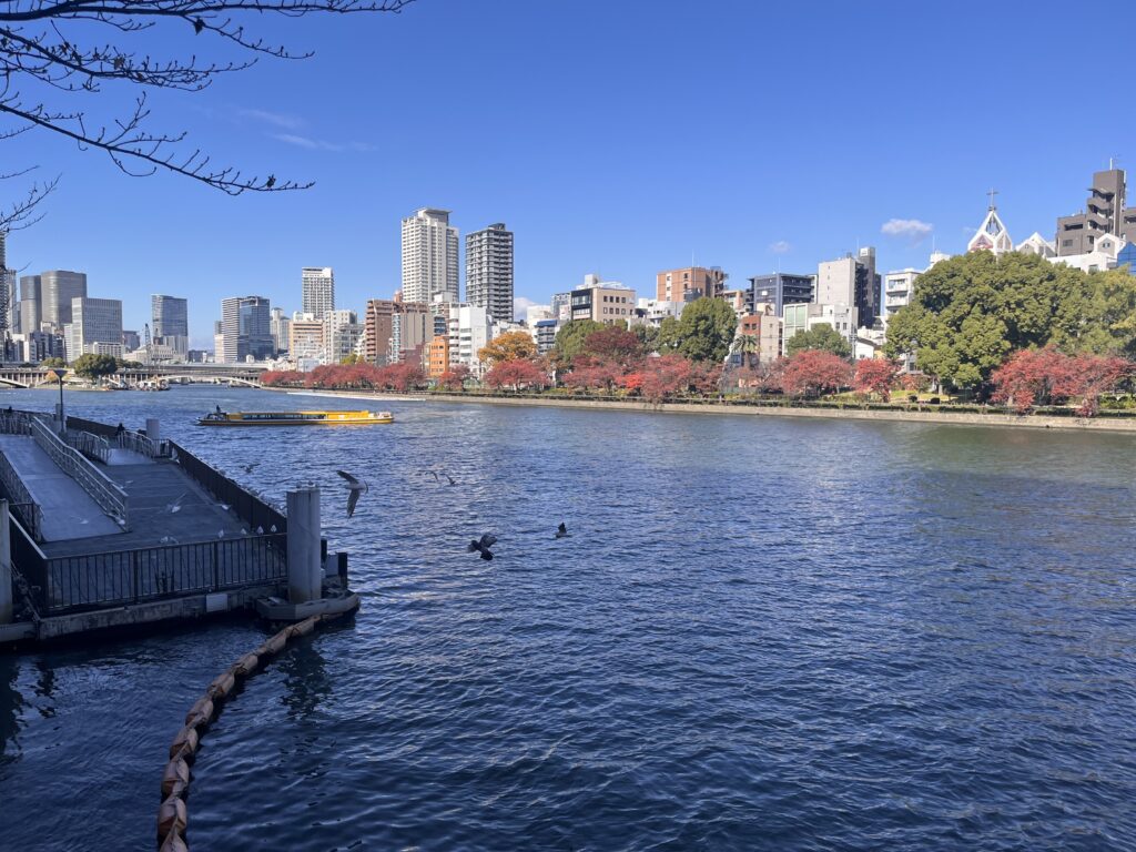 天満橋の前、八軒屋浜は、向かいの大川公園が見渡せる。