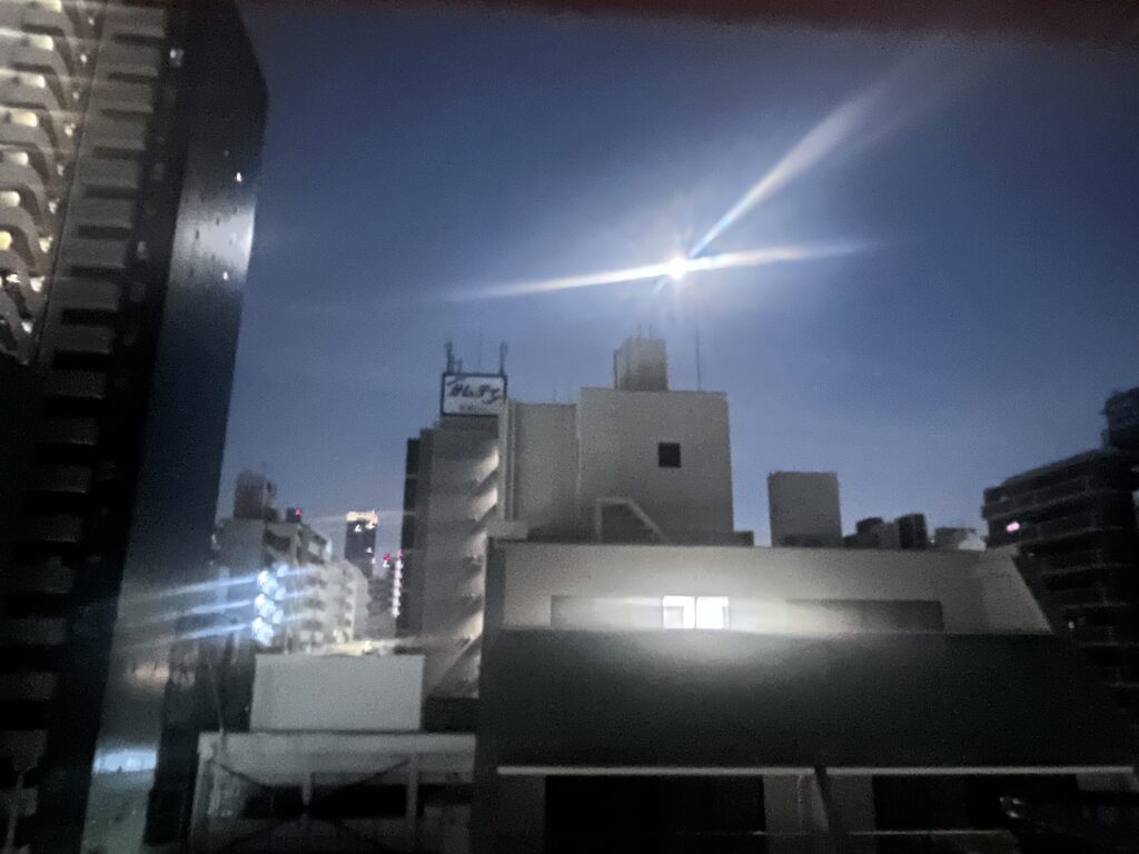 2025年5月14日 / 最終更新日時 : 2025年5月14日 hashimoto 家族 家族で各地で月見。 昨晩、おかんと姉、弟、ワシの4人のLINEに、おかんからメッセージ入る。「今晩、旧暦十六日やけど、満月。晴れてたら空見て」。 早速姉から写真が入る。 昨日の月は低かったようで、ビルの谷間にある我が家からは、屋上に登っても、月、見えず。 夜中、もう一度見ると、スマホで撮るの難しいくらいの明るい満月。どうにか撮ろうと、絞りを変えて、いろいろやってみた。 義妹が、退院したばかりの弟からの、報告はなかったけど、メッセージ見て、少しは心が晴れてたらええな。 Follow me! @dodomeippatsu FacebookXBlueskyHatenaCopy コメントを残す コメントをキャンセルメールアドレスが公開されることはありません。 ※ が付いている欄は必須項目ですコメント ※ 名前 ※ メール ※ サイト 次回のコメントで使用するためブラウザーに自分の名前、メールアドレス、サイトを保存する。 上に表示された文字を入力してください。 Δ