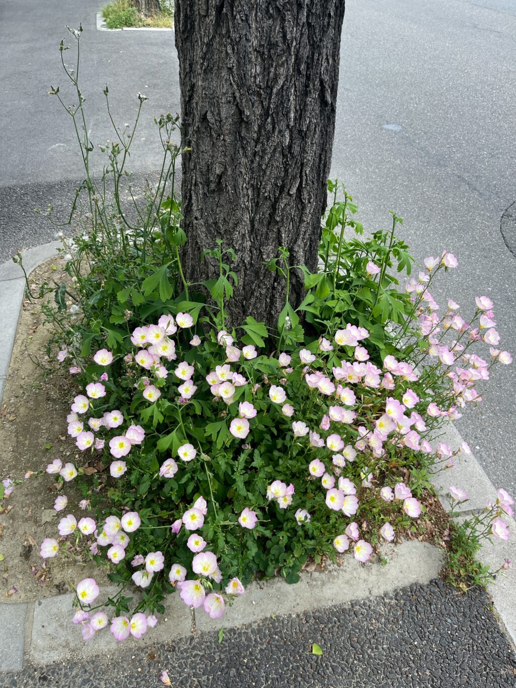 バス降りると、街路樹の下に、かわいい花。