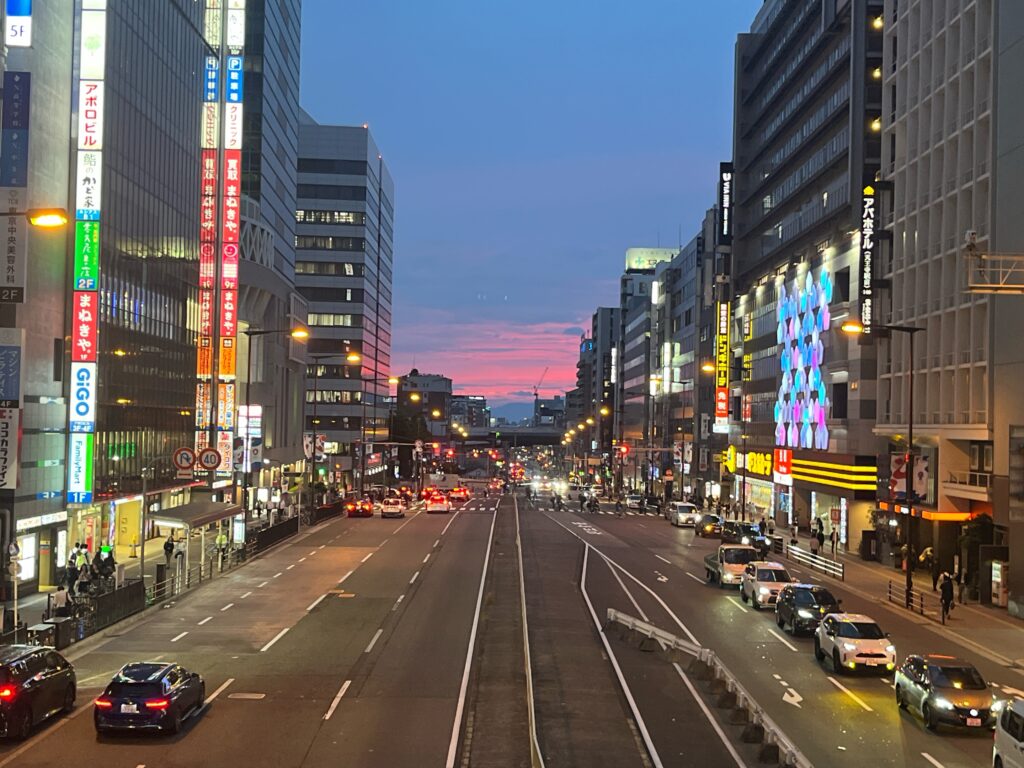 外に出ると、なんか朝焼けのような濃い色の夕焼け。