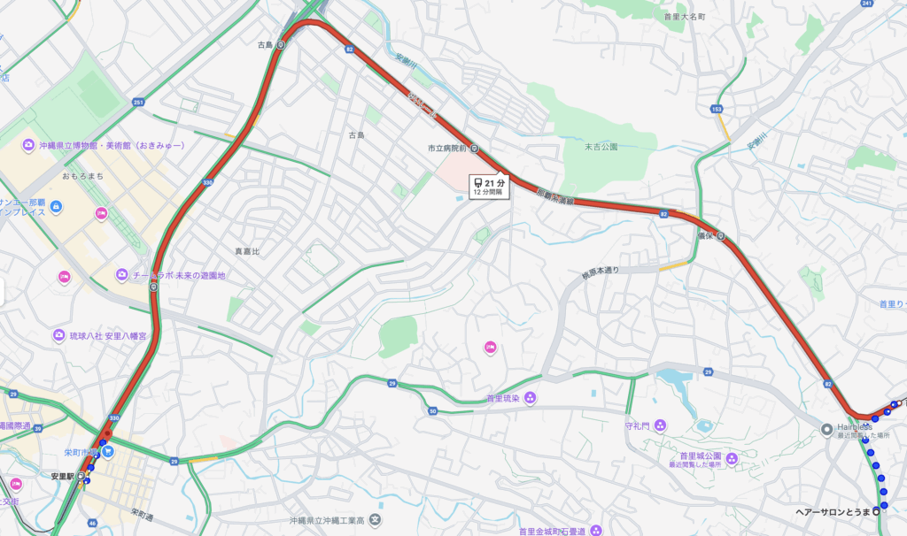 右下の青い点線の下の先が「ヘアーサロン とうま」。