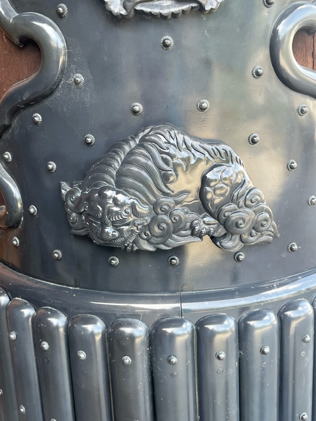 傷まないよう施された金属製の柱根巻に彫られた獅子、