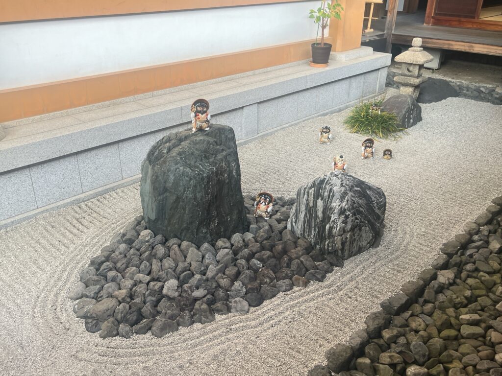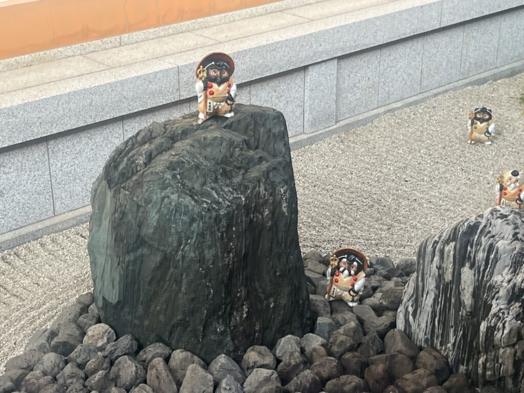 その石の上に行者バージョンの信楽焼たぬき。
