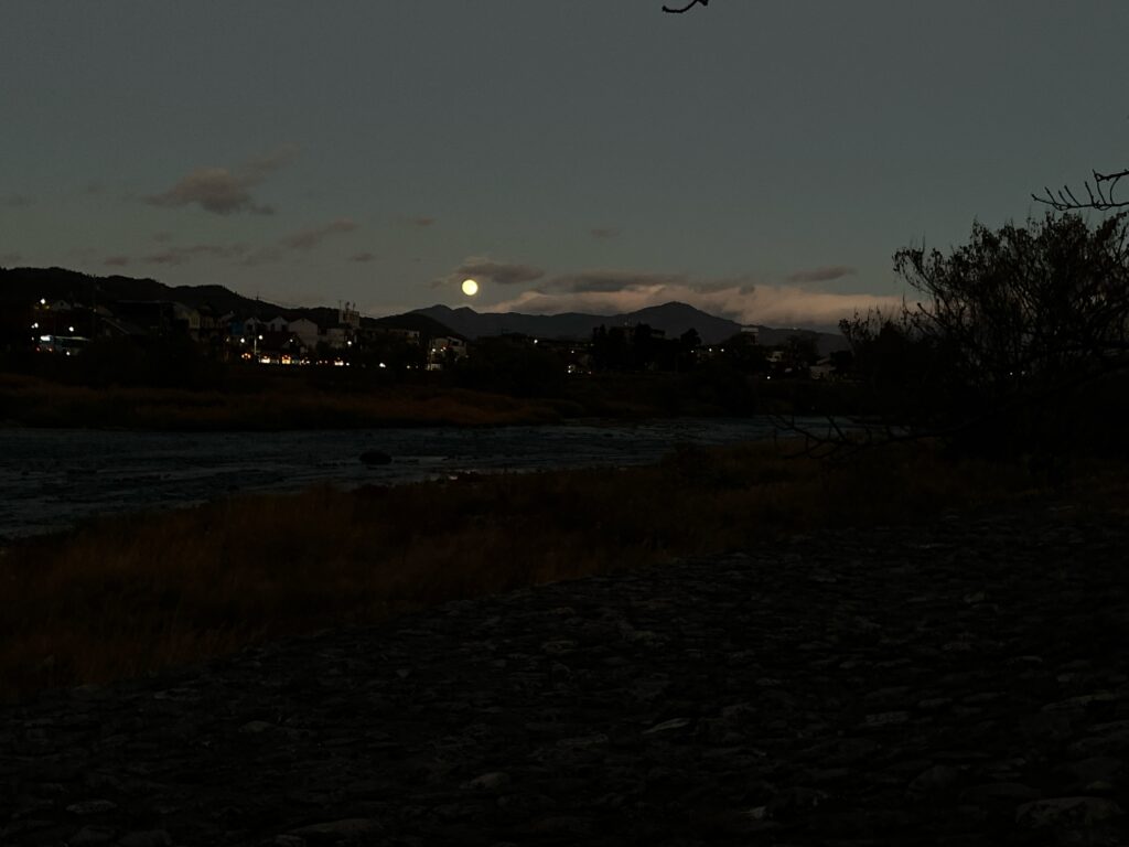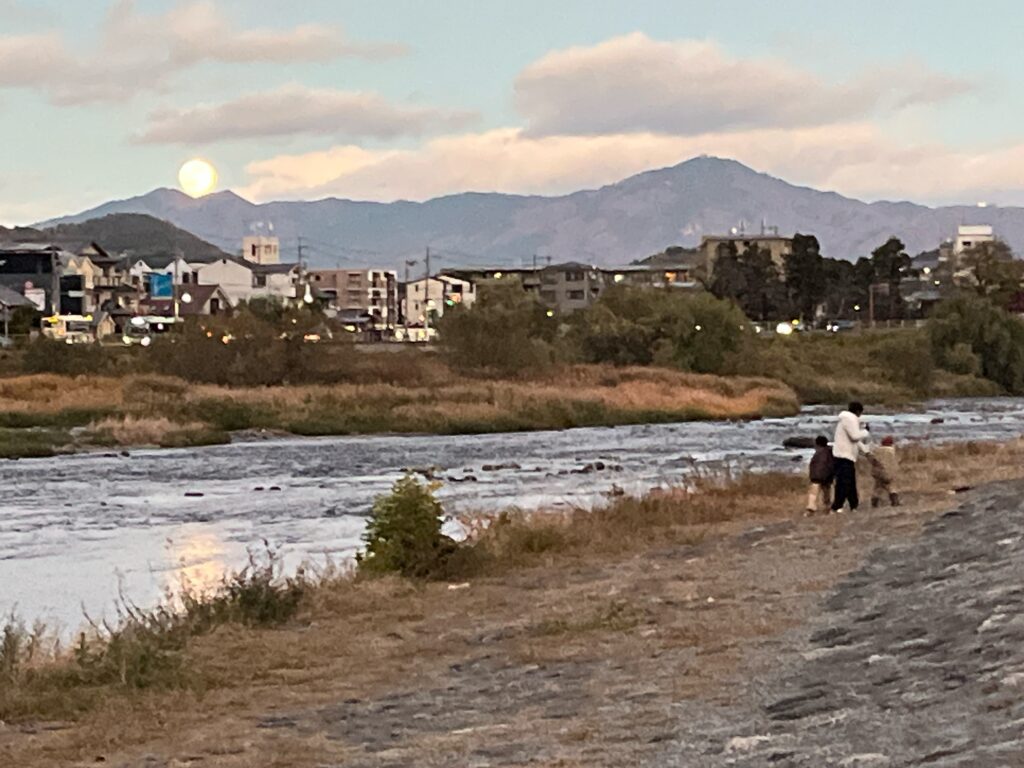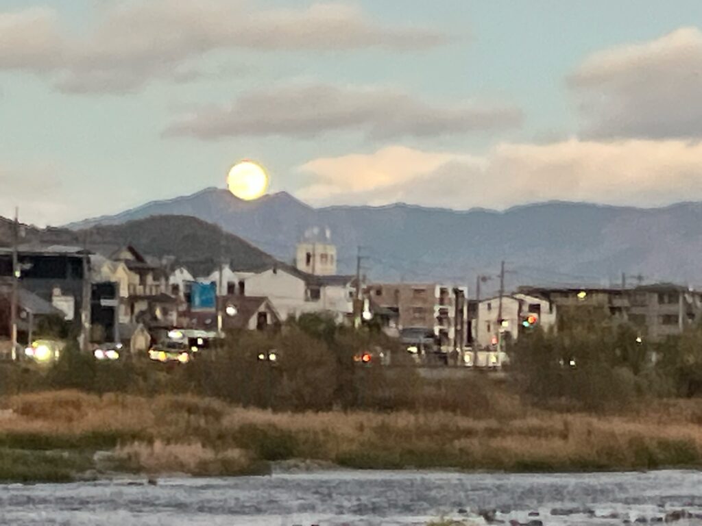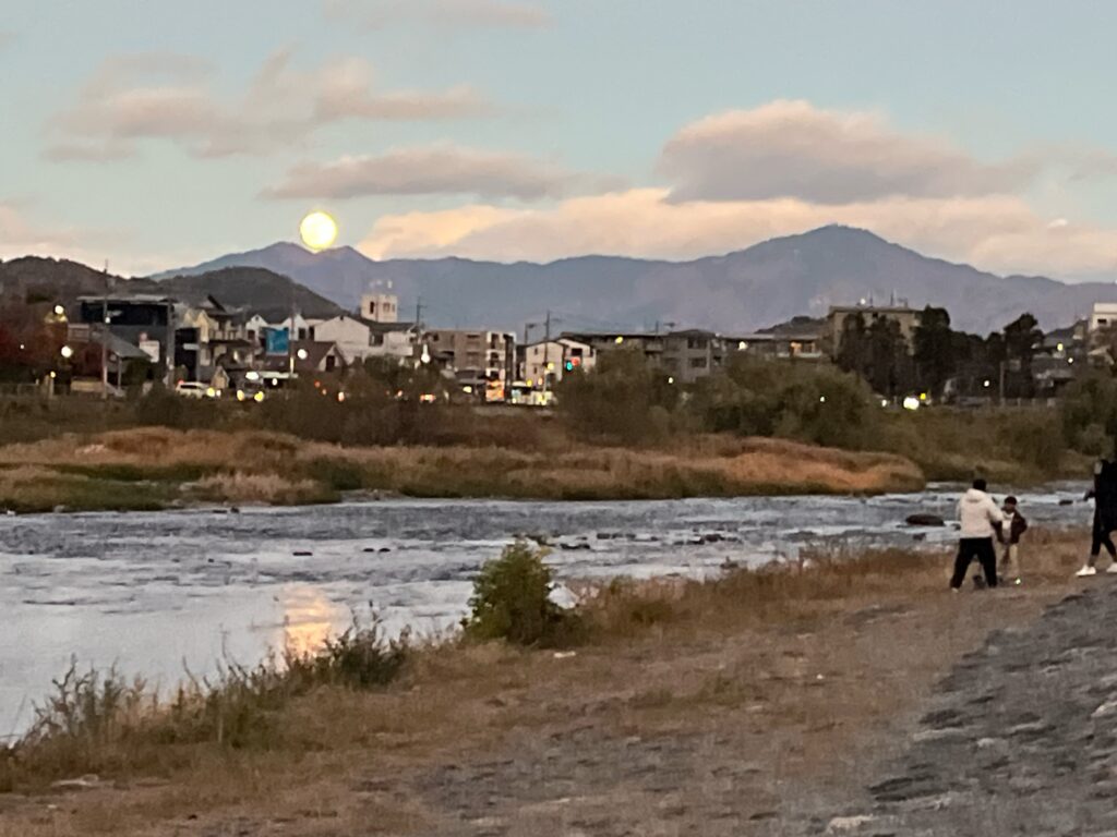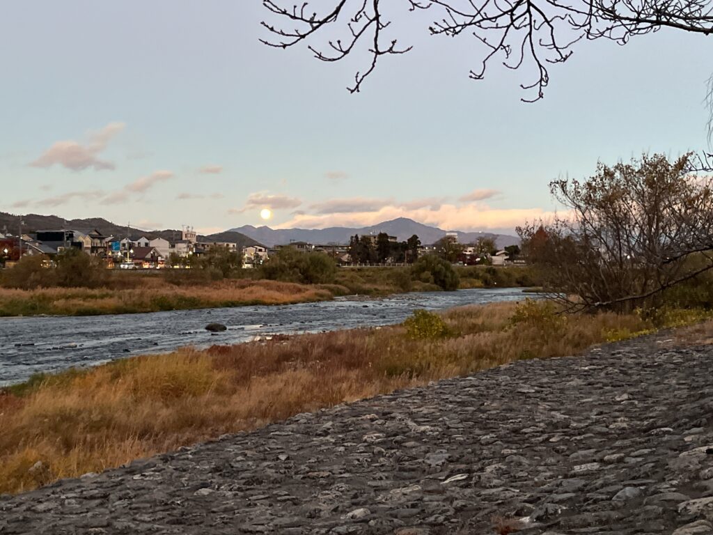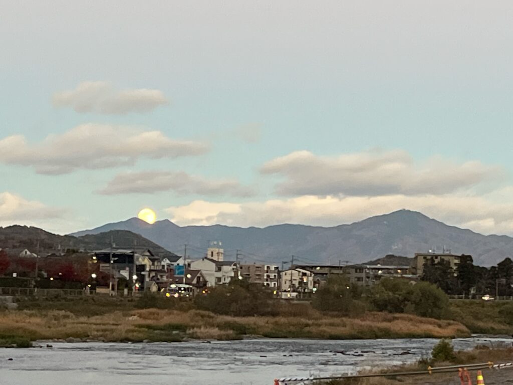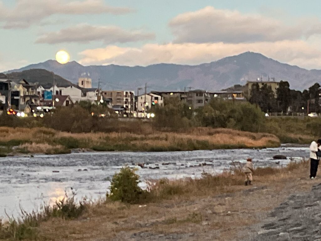 桂川から観る比叡山と、比良山に上る満月なんて、