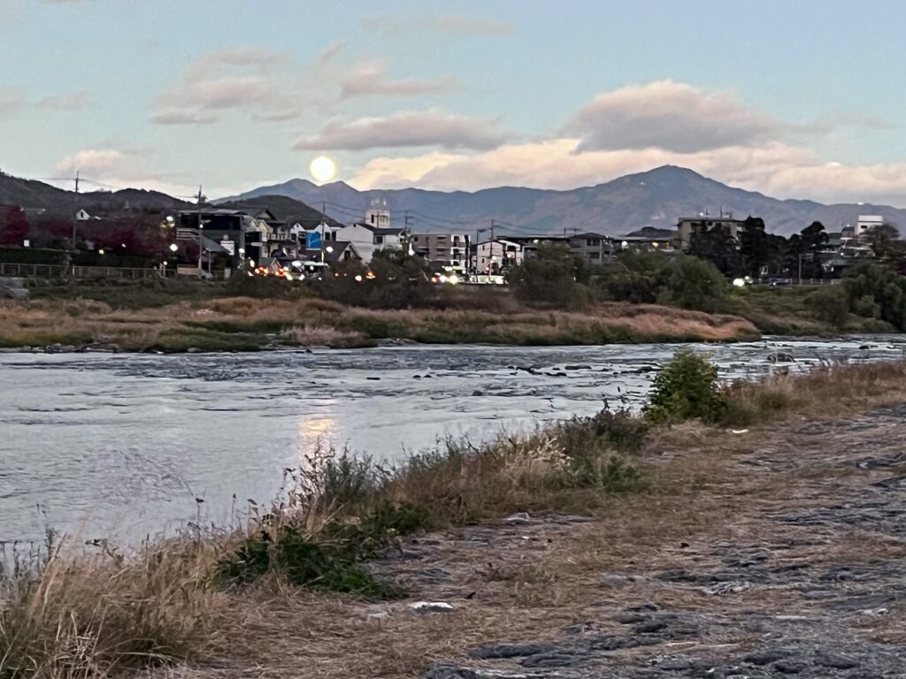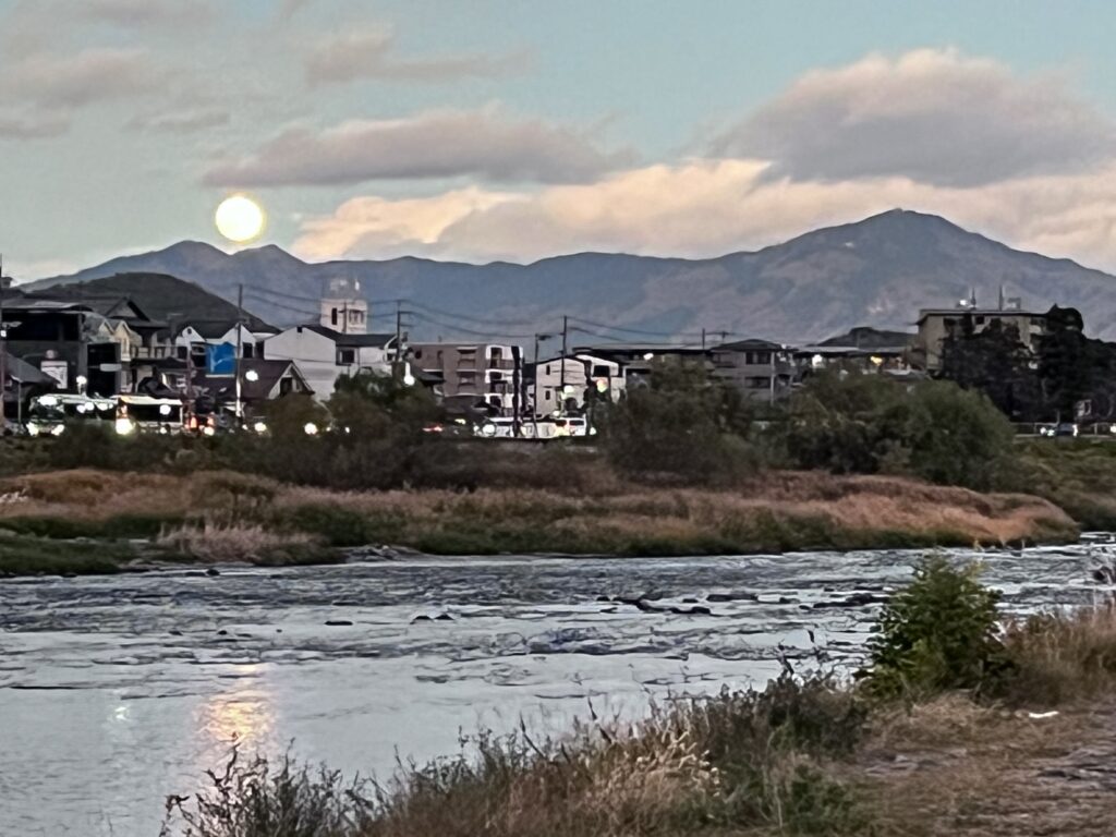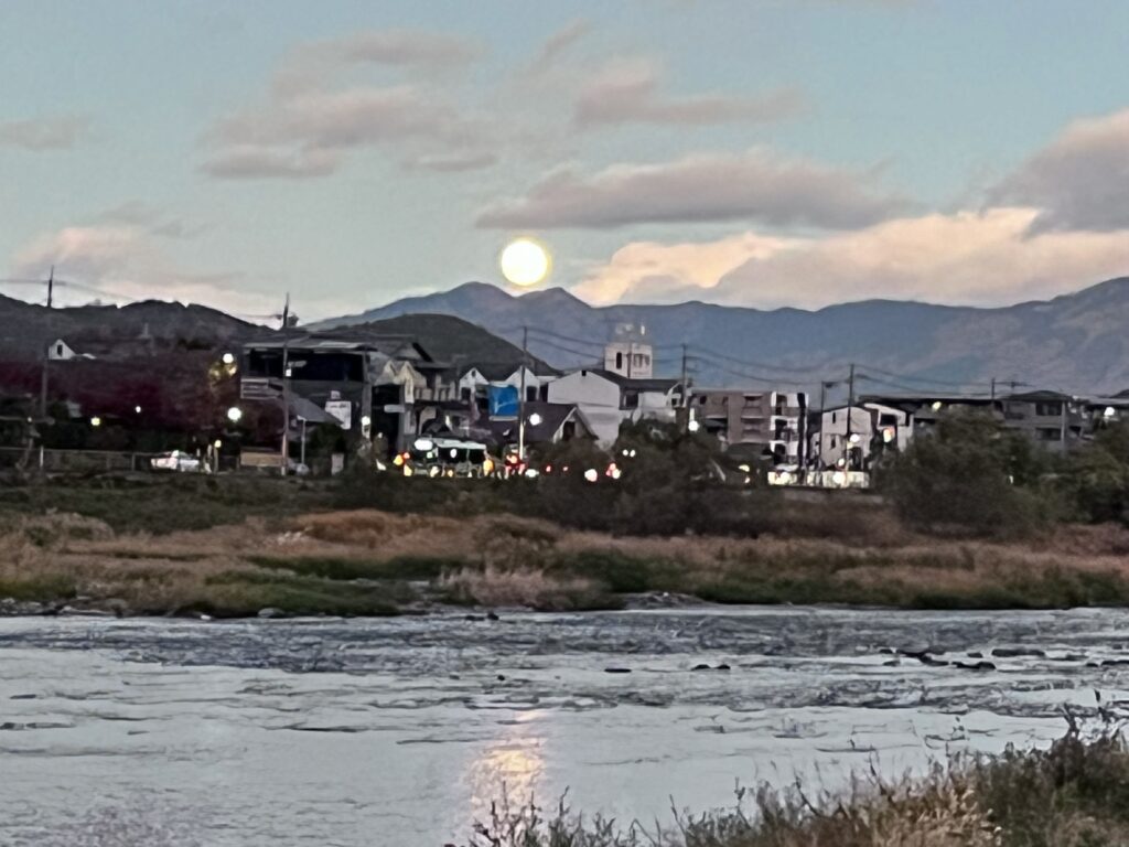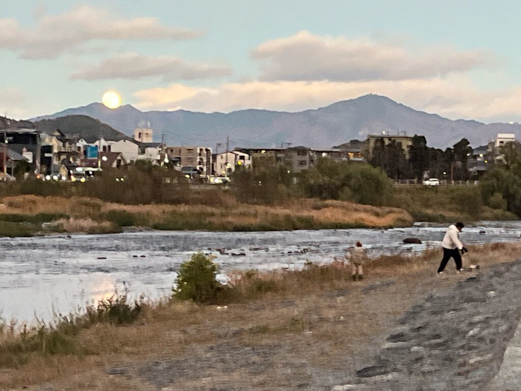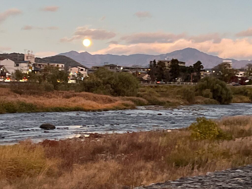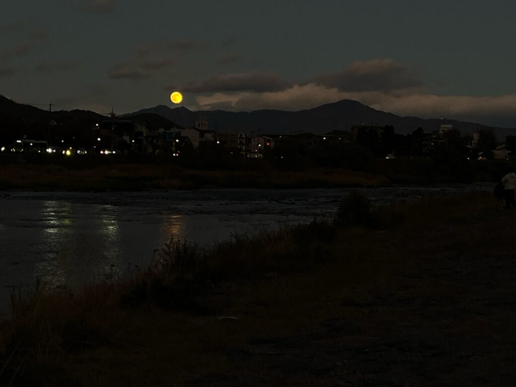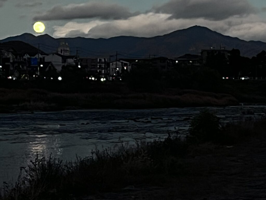 桂川から観る比叡山と、比良山に上る満月なんて、