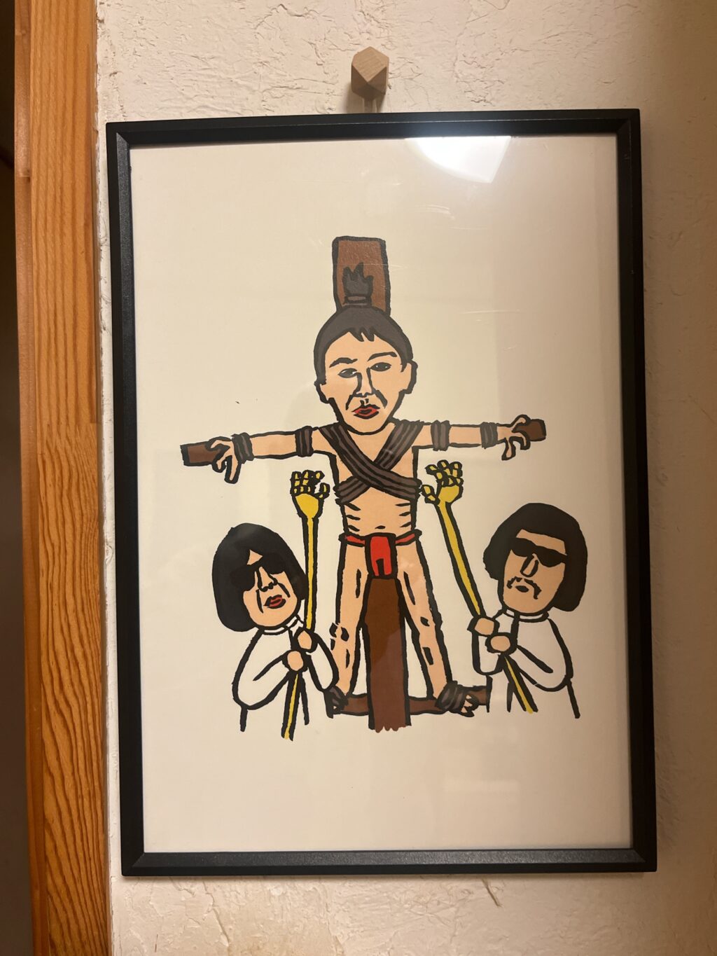 一枚目、トイレの写真、カニくんのイラストの向こうの額は、