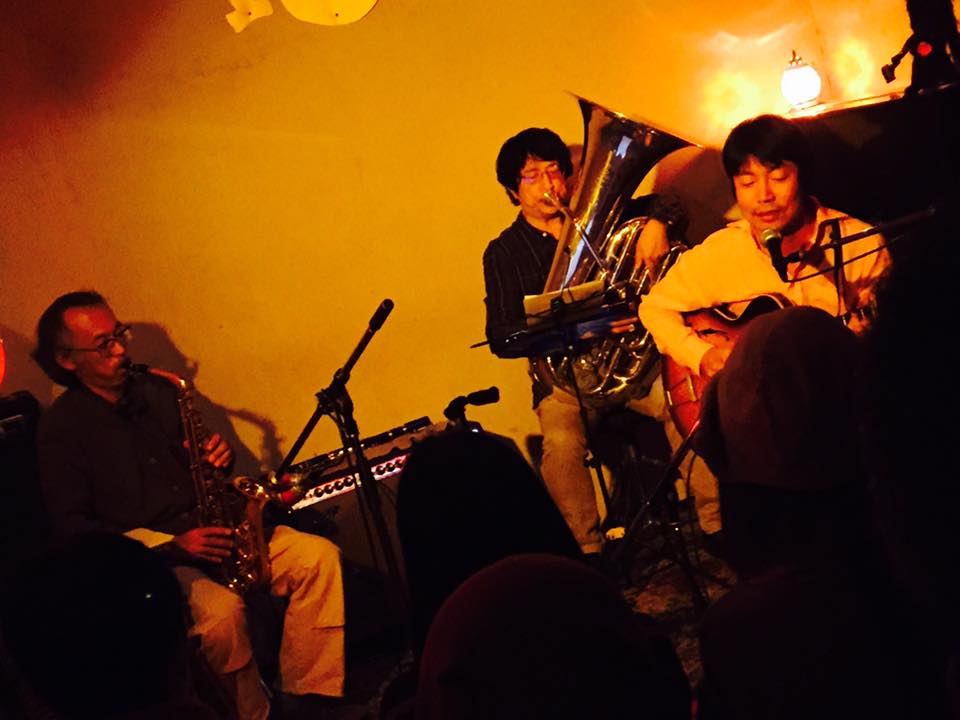 出演者の、鈴木常吉さん、AZUMIさん、中尾勘二さん、関島岳郎さん、