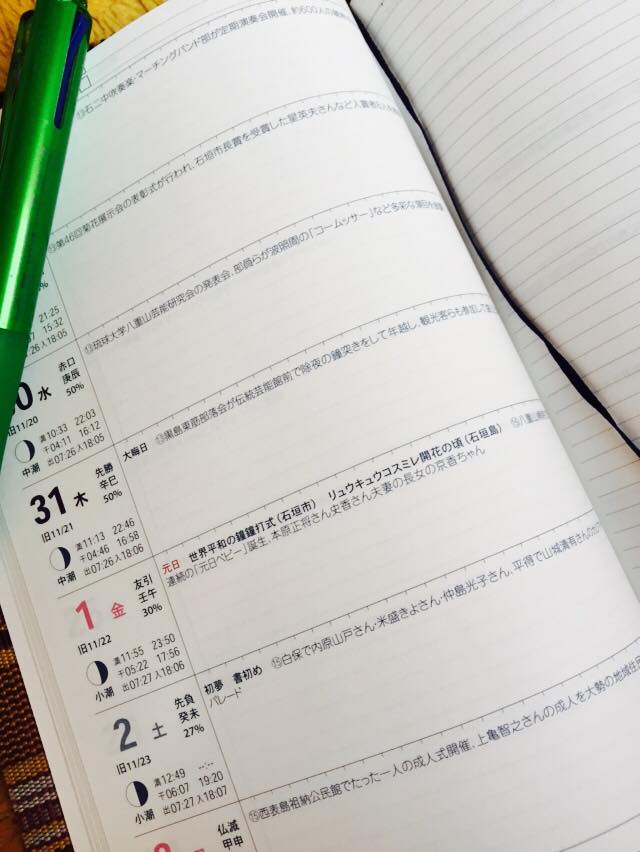 2016年1月2日 / 最終更新日時 : 2025年1月2日 hashimoto 沖縄 2016年度版、八重山手帳。 今年も八重山手帳。今年はミンサー織のカバーが付いて、バージョンアップ! ちなみに去年の今日は、白保で内原山戸さんと、米盛きよさんと、仲島光子さんが、平得で山城清有さんが、カジマヤーパレードを行いました。 なんぼ長寿県でも、四人同時のカジマヤーは珍しいやろな。 ちなみにカジマヤーは97歳のお祭。97歳になると子どもに戻るってことで、カジマヤー(風車)を持って、たいていは乳母車みたいなのに乗って、町中をパレードしてお祝いする沖縄の風習。 Follow me! @dodomeippatsu FacebookXBlueskyHatenaCopy コメントを残す コメントをキャンセルメールアドレスが公開されることはありません。 ※ が付いている欄は必須項目ですコメント ※ 名前 ※ メール ※ サイト 次回のコメントで使用するためブラウザーに自分の名前、メールアドレス、サイトを保存する。 上に表示された文字を入力してください。 Δ