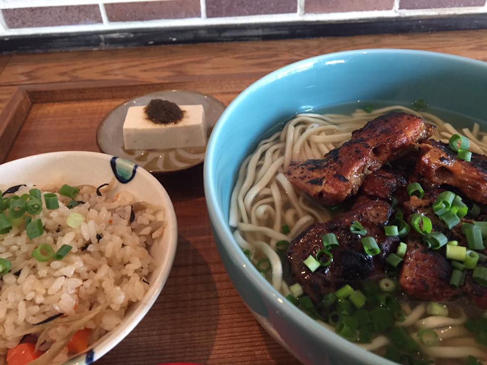 食ったのは炙り軟骨ソーキそばとジューシーのセット。