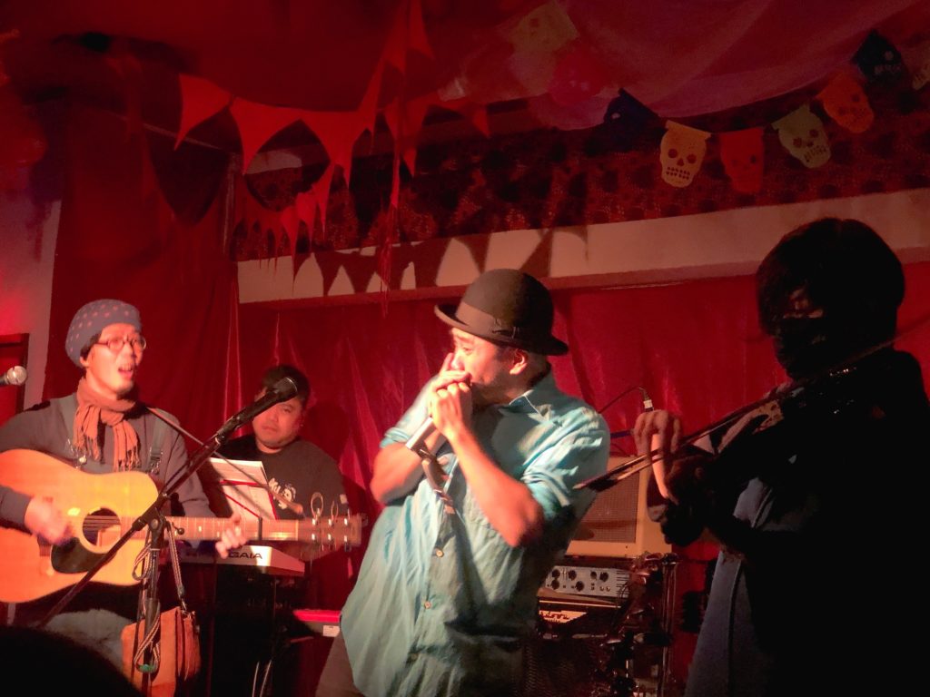 メンバーはハーモニカの清野美土さん、フィドルの大渕愛子さん、ギターの長尾晃司さん。